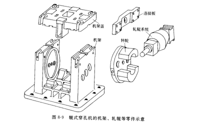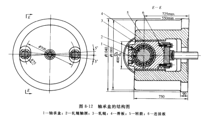 穿孔机的主传动是由异步电动机经减速箱,万向将方向相同的旋转运动传给工作轧辊2,每个轧辊的两端辊径置于轴承盒3中,两个轴承盒用连接板连接在一起,房在圆形转鼓10的滑槽内,转鼓是置于机架下部用螺栓安装的两个圆弧形底座上(见图8-8,图8.9)