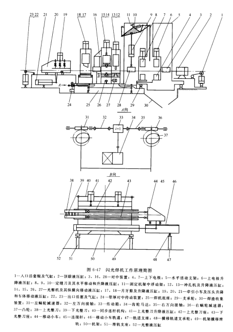 闪光焊机由电机及焊接装置,焊缝定位装置,带钢与机组线对中装置,冲孔装置,光正装置,月牙剪,带钢板厚对中装置机焊渣收集装置组成,图6-47所示为闪光焊机工作原理简图。