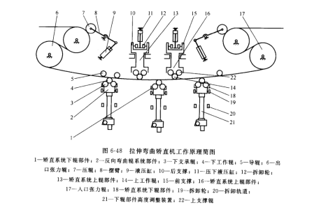 图 6-48 所示为拉伸弯曲矫直机工作原理简图。拉伸弯曲矫直机由张力辊及张力辊主传动装置、压辊装置、上矫直辊装置和下矫直辗装置组成。