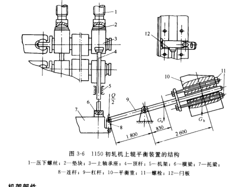 初轧机的轧制压力很大,所以一般都采用闭式机架。它与一般机架不同之处在于∶牌坊前后立柱的下部各有一个安装机架辊的孔和燕尾槽 (见,图 3-7),燕尾槽也是为安装机架辊用的,也就是机架每个立柱上留有放置两个机架辊的位置。初轧机上设置机架辊,其原因是在头几道轧制时,轧件很短,为了便于喂钢,必须配置有驱动装置的机架辊。为了适应重锤平衡,在机架立柱上、窗口内侧每边都有容纳平衡顶杆的槽,此两槽反映在机架下横梁上为56图 3-7 1150初轧机机架的主要加工面相应的两个通孔。