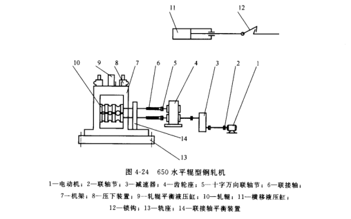 650水平辗型钢轧机如图 4-24所示。主要由主传动装置、机架、机架换移装置、压下装置、轧辊平衡装置、轨座等组成。