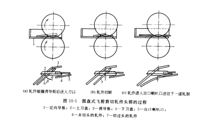 圆盘式飞剪剪切轧件头部的过程如图 10-1所示。飞剪的剪切机构由一对转动方向相反的圆盘刀片组成,圆盘式飞剪之所以能横向剪切运动着的轧件,主要是由于刀盘轴线与轧件运动方向倾斜一定角度,并目使圆盘刀片圆周速度在轧件运动方向上的分速度与轧,件运动速度相等。