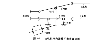 其那面说过,万向连接轴一般都比较长,重量也比较大,为老不使万向接轴的重量全部压在两端的插头上,一般都设置了联轴的平衡装置。其平衡力一般比连接轴重量重10%~30%。常用的平衡装置又弹簧平衡,中锤平衡和液压平衡三种形式。弹簧平衡一般只用于下联接轴的平衡,如图3-11所示。因为下联轴轴所连接的轧辊在轧制过程中是不需要调整其位置的。上连接轴因为在轧辊过程中辊提升两较大,老的轧机用重锤平衡,较新的轧机都使用液压平衡。